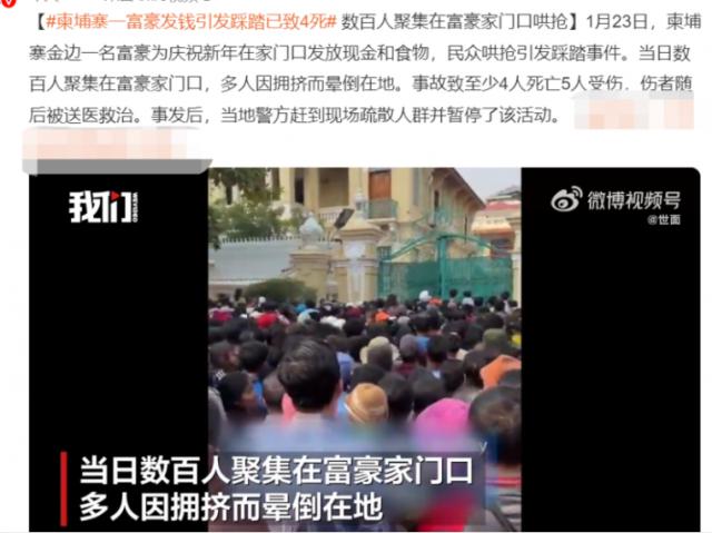 一个有钱人想过年做好事,就把现金和食物放在家里,让有需要的人自己收。这是一个好行为,但没想到100多人来了,场面瞬间失控。很多人因为拥堵晕倒在地,甚至有些人失去了生命,最终导致至少 4 人死亡,5 人受伤。