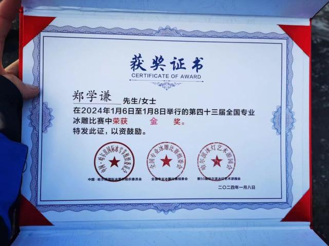 从 2014 每年开始参加比赛,持续 10 每年参加四、五次冰雕比赛。长时间的比赛快速增长。郑学谦获得无数奖项:第八届“广厦杯”国际大学生冰雕艺术大赛金奖、第四十三届全国专业冰雕大赛金奖、第一届哈尔滨冰雪文化博物馆冰雪造型艺术大师赛一等奖...但郑学谦说:“我是每场比赛的学生。虽然我工作了这么多年,但我还是要学习很多。"