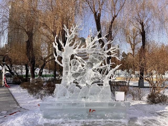 这个冰雕设计新颖,小姑娘的手触摸着轻盈透明的“湖”,产生了圆圈波澜。湖边的树上,树叶上堆着冰雪,树叶上挂着雪滴。梦幻般的场景让审美水平很高的哈尔滨人不断称赞:“这是怎么做到的?”