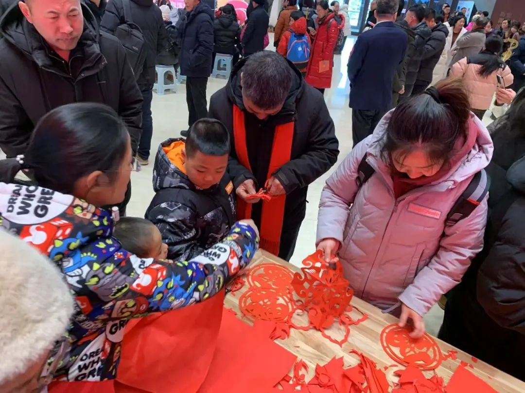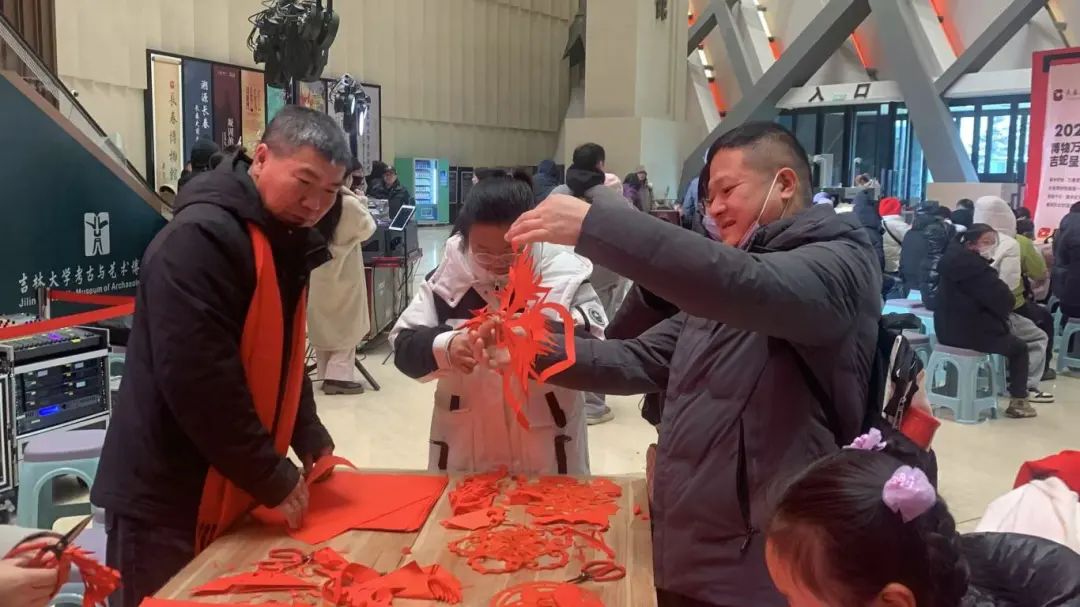 现场还设置了董氏糖画、关氏满族剪纸等非物质文化遗产展示和体验馆。关氏满族剪纸的传承人关长宝在现场进行了剪纸表演。他手里拿着剪刀,上下修剪,一张纸变成了他手里精美的剪纸作品。在关长宝的现场指导下,许多市民和游客也加入其中,感受剪纸的快乐。
