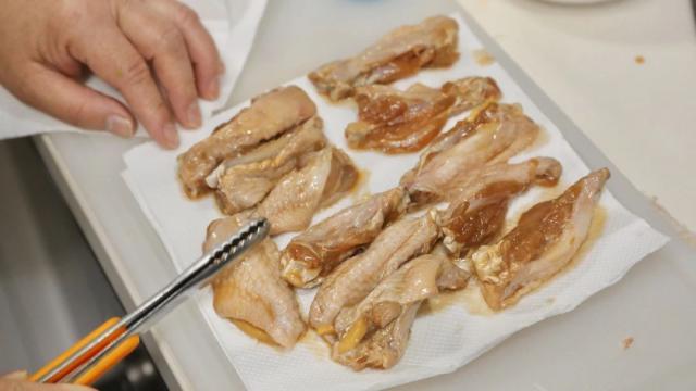 将鸡翅洗净,切成两半,加入适量的葱丝、姜丝、白胡椒、盐、酱油、生粉,腌制 20 一分钟后,用厨房用纸吸水。
