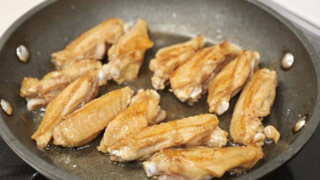 锅内加入少许油,将鸡翅带皮一面放入锅中,用中火煎至一面金黄,然后翻面,继续煎至两面金黄。