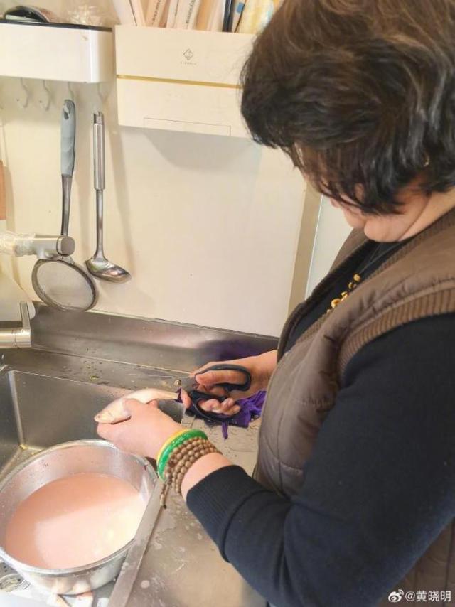 他展示了母亲去剧组给自己做午饭的场景。当时黄妈妈穿着很随意,但是手腕上戴着绿色的玉镯和金色的手镯,显示出她的高贵精神。她专注于用剪刀处理鱼,态度自然。她已经对这种家务很舒服了,贤惠干练的形象也很明显。
