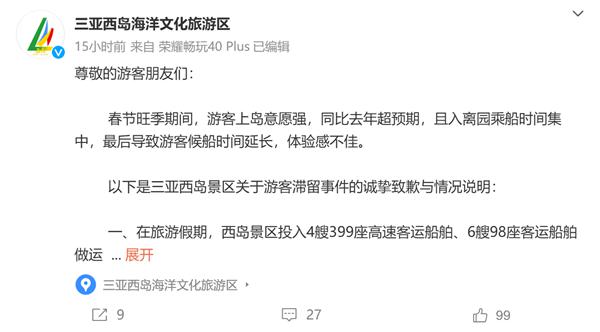 春节期间,游客愿意上岛,比去年超出预期。此外,他们离开公园时间集中,最终导致游客等待时间更长,体验不佳。三亚西岛景区真诚道歉,说明游客停留情况。
