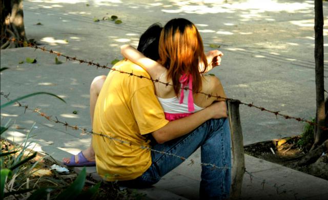 2013 年 7 月 10 一天,情侣们在工业区外的街道上拥抱。