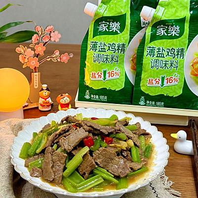 8、将炒好的牛肉倒入锅中,与芹菜一起快速炒匀,加入适量的盐和家乐薄盐鸡精调味,翻炒均匀后即可出锅。