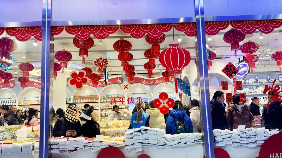 南京路世纪广场禧市场满足了市民和游客对春节期间购买年货、赠送礼物和收藏纪念的需求,并设立了许多文化展示场景,如非物质文化遗产、民间小吃和文化互动。还在现场打造了一个滑冰场,深受孩子们的喜爱。来自世界各地的游客挤满了“年味”的步行街商店。
