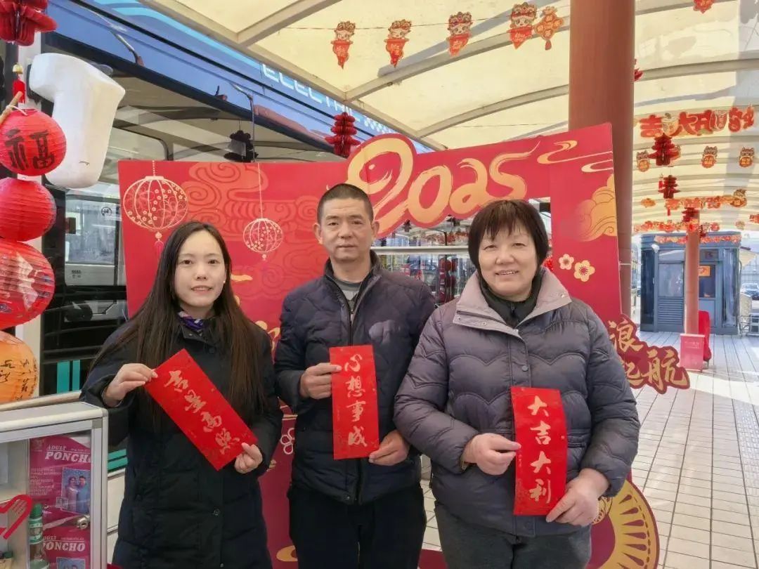 站台工作人员穿着整洁的制服,面带微笑,手里拿着一对美丽的对联,向每一位过去的乘客送去新年的祝福。“祝你新的一年家庭幸福,万事如意!”工作人员热情的话语中充满了对乘客的关心和祝福。乘客接过对联后,脸上洋溢着惊喜和情感。他们中的一些人迫不及待地想欣赏它,并与工作人员交谈,分享他们对新年的美好期待。