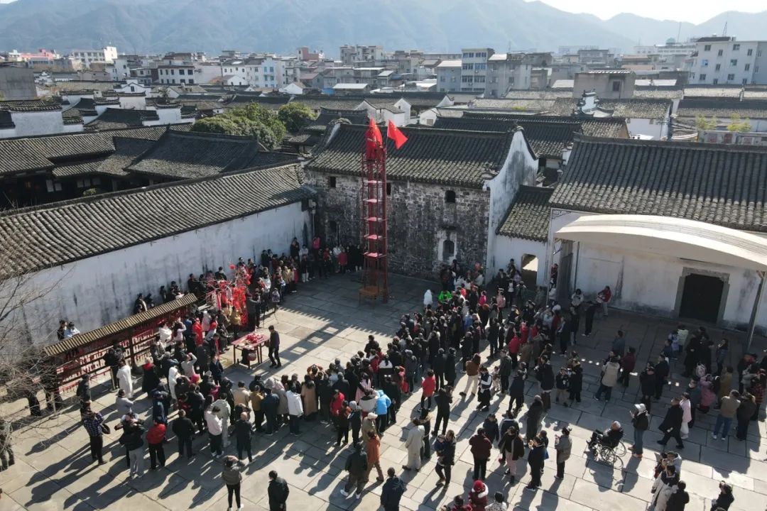 第一天下午,卢宅景区梨园广场人头攒动,热闹非凡,一场精彩的翻九楼表演吸引了众多游客驻足观看。