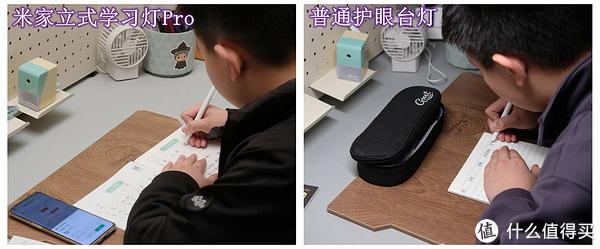 通过对照片的对比,可以很容易地看到米家立式学习灯在右侧。 Pro 更加明亮均匀,照片中笔的颜色也更加恢复。