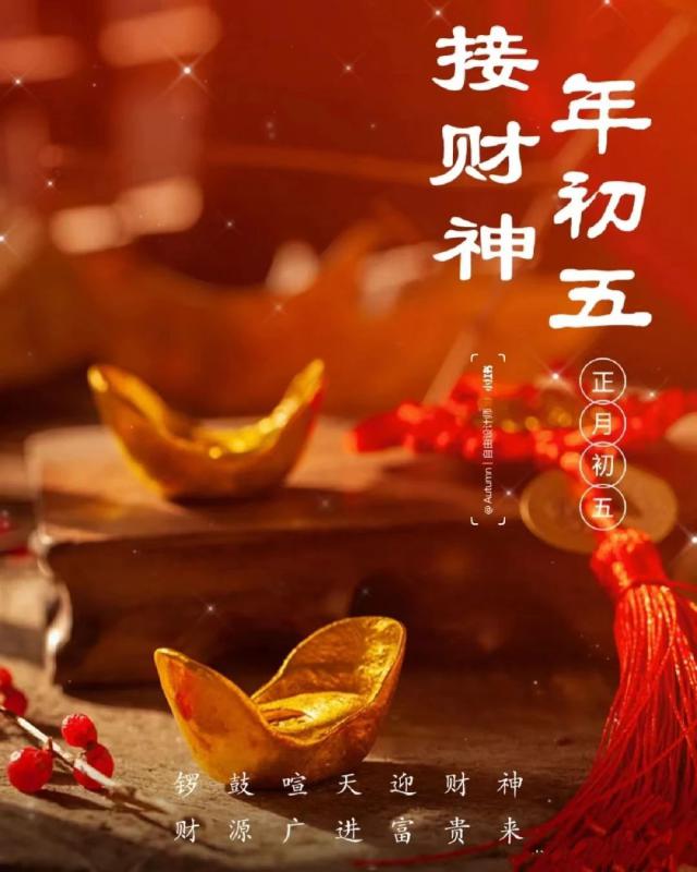 正月初五财神日,短信会先发给你:愿你出去发财,头上浮财云,走路捡元宝,走进财富森林,遇见财神,让他们一起祝福你:财源广进!