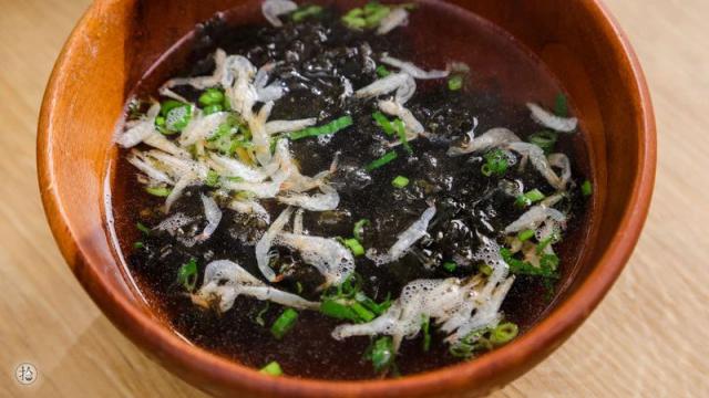 将少量紫菜、虾皮、葱花、一小勺酱油放入碗中,