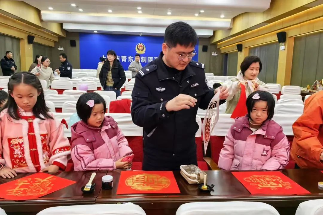 警察“书法家”们泼墨,一副精致的春联充满了节日的祝福,温暖和期待每一个字都在流淌。随着现场气氛和谐热烈,小书法爱好者也参与其中,每一个人都沉着冷静。随着笔尖在纸上流畅上升,一副春联和一句祝福的文字飞了过来。红色的春联和“福”字跃然纸上的那一刻,也把满满的祝福送进了大家的心里。