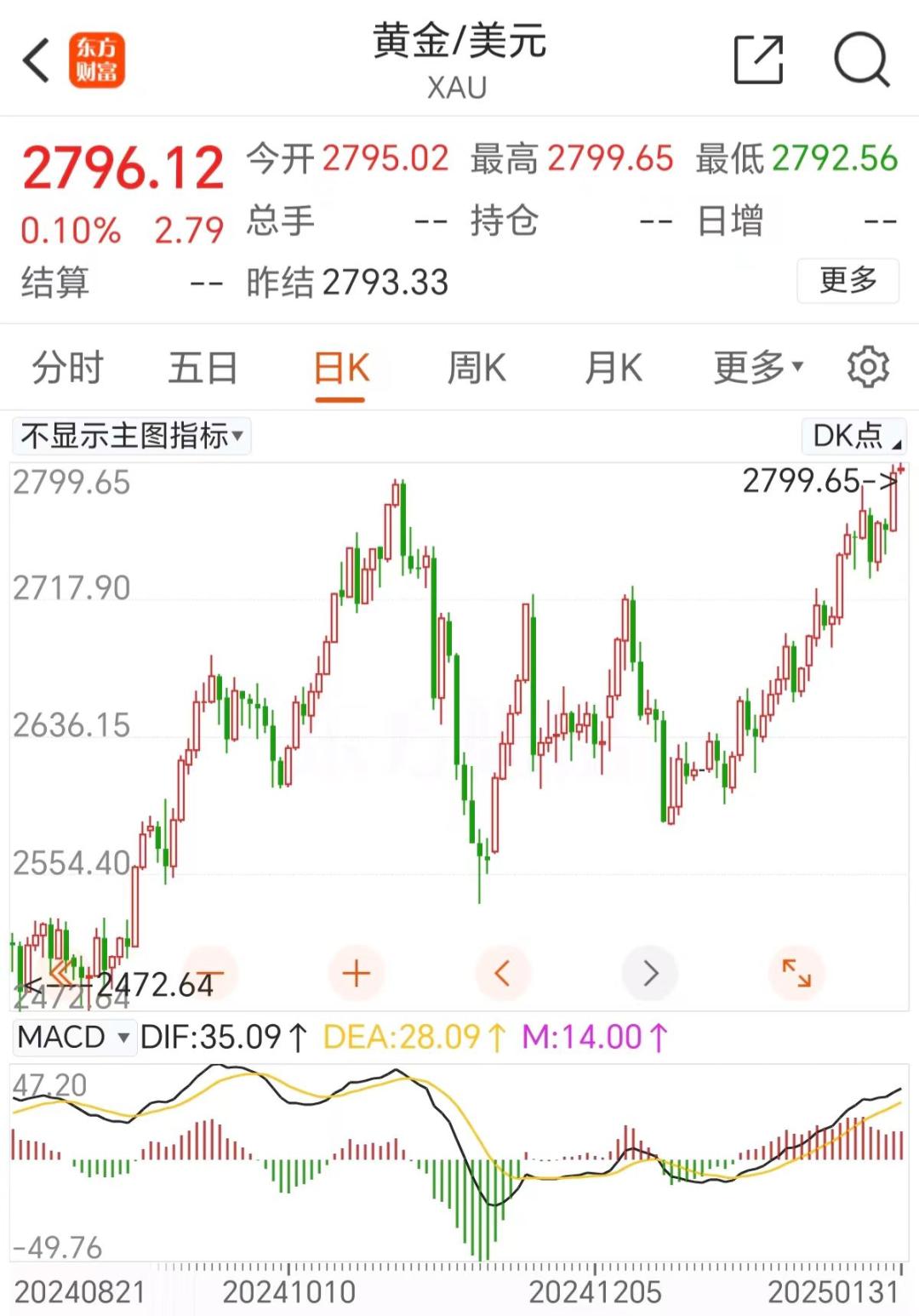 国际黄金价格再创历史新高!当地时间1月30日,国际黄金价格(以美元计价的伦敦现货基金)曾在欧洲交易期间触及每盎司2800美元的历史新高,COMEX黄金期货市场也走出了每盎司2860美元的新高。截至发稿时,上述两者仍徘徊在历史新高价附近。