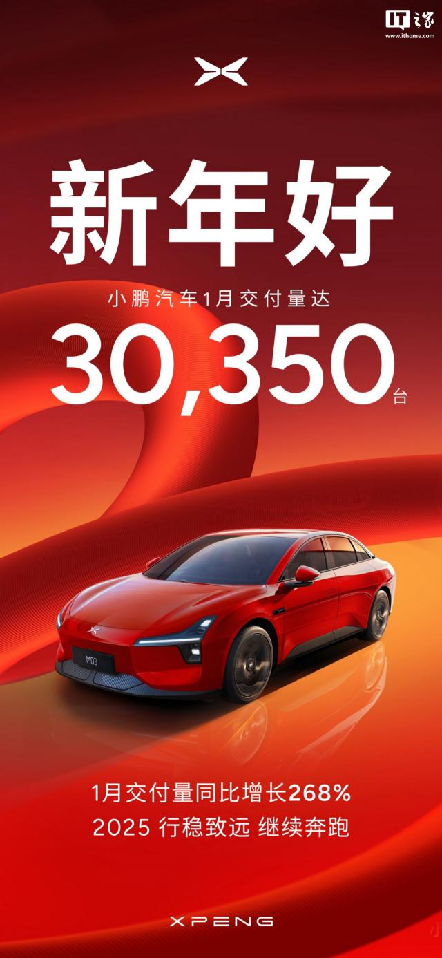 小鹏汽车 2025 年 1 新车每月交付一次 30,350 台湾,同比增长 268%。