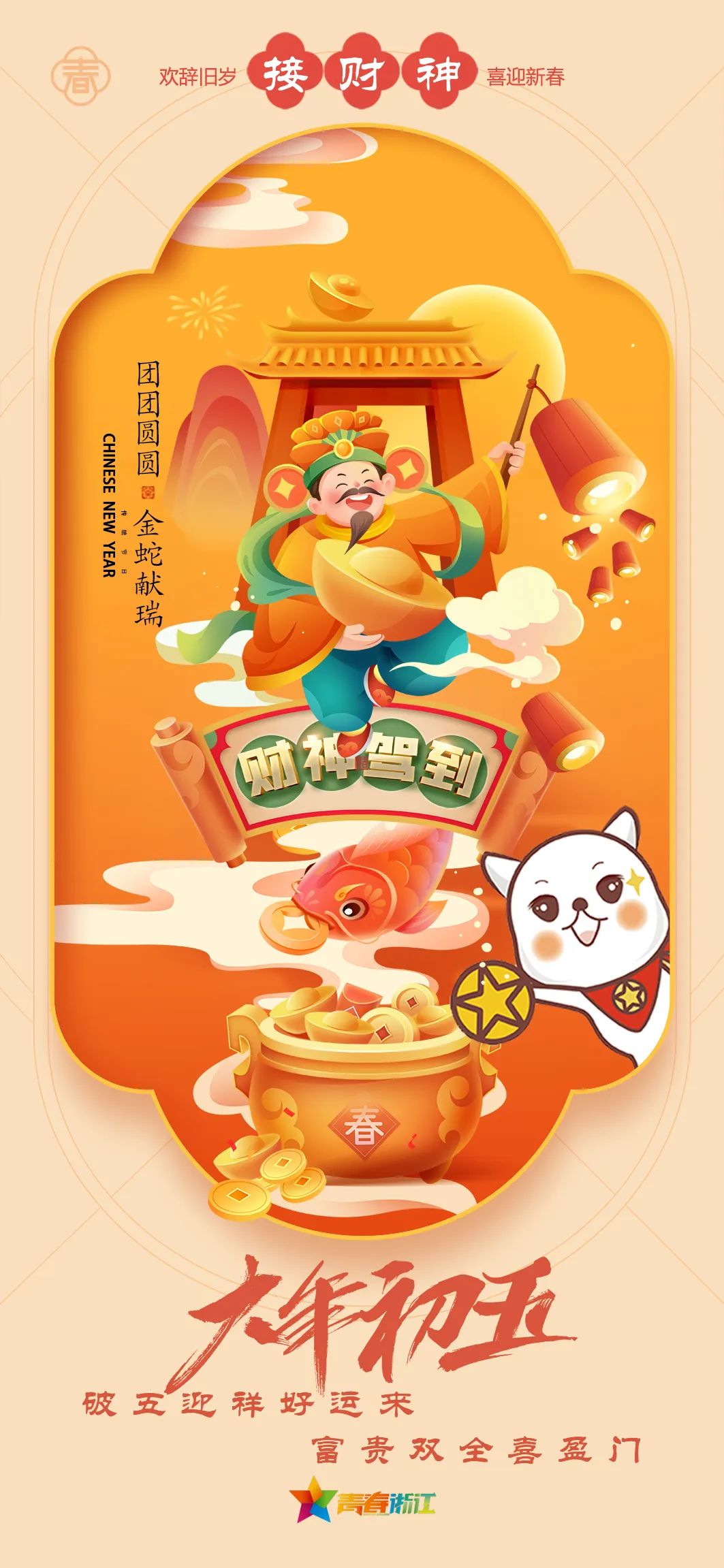 元旦第五天接财神,新的一年有钱又健康!和“青春浙江”一起进入快乐时刻!收到华丽的蛇年红包,查看来自全国各地的新年祝福,趁着假期去本省逛逛有趣的习俗。当然,也有属于年轻人的新年解决方案。今年春节,邀请你和浙江团一起过春节。