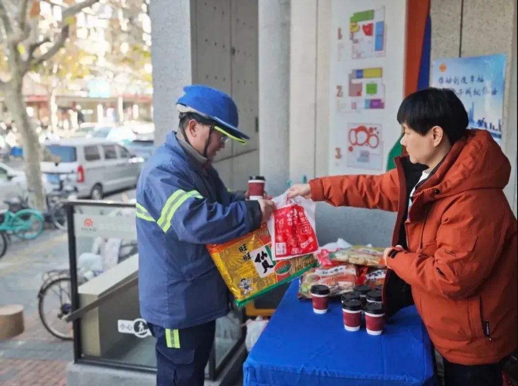 活动当天,梅川党群服务中心充分发挥了服务阵地的桥梁纽带作用,积极将关怀交给户外劳动者和社区新就业人员。一方面,中心工作人员走访了周边“小专业”(小微企业、个体户、市场)和丁咚驿站的从业人员,为他们送去了包括蛇油护手霜、暖贴、暖手宝在内的护理包;另一方面,中心位置入口处设置了暖心服务摊,提供姜茶、暖手宝等物资,为环卫工人、清洁工等户外工人驱散冬季凉意。"每天骑车送件,手总是冻得通红,这些物品太实用了,真的很感谢梅川党群服务中心!”收到礼包的快递员小王感慨地说。