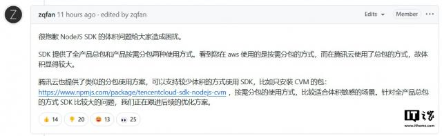 开发者 batchor 昨天在这个项目上 Issues 中吐槽称,腾讯云 NodeJS SDK 打包后接近 而竞争产品亚马逊云100M AWS 打包仅 13M。截至 IT 世家发帖,该吐槽得到了。 2198 一种赞美表情的认同。
