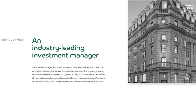 Sona Asset Management 它是英国的对冲基金,管理着 101 亿美资产。据说 Preqin 数据显示,Sona Asset Management 管理着 7 只有对冲基金,采用信贷多空策略,这也是对冲基金常见的投资策略之一。