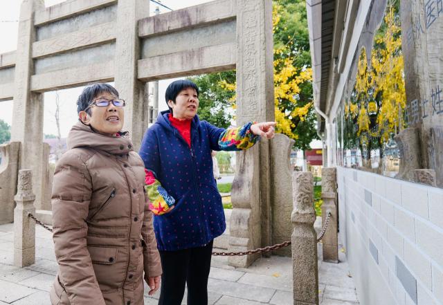 一大早,许多三官堂居民聚集在阮氏牌坊周围,前来散步和散步。他们有时在银杏树下走来走去,聊着童年的往事,有时在展墙上研究阮氏牌坊的历史文献。