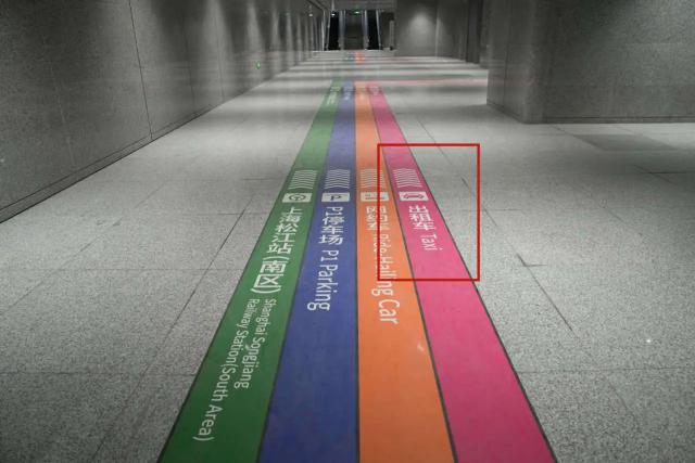 乘客们沿着扶梯前去 B1 层,步入南 1 门,沿着地面显眼的标志行走到出租车上客点。