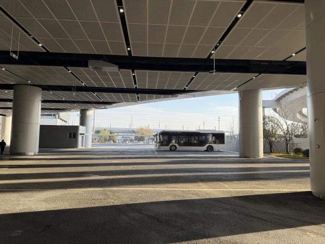 乘客离开南区后,沿着通道行走,通过门向左转,向前走,可以看到右前方的公交枢纽。