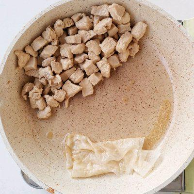 6、再加入鸡肉丁翻炒变色。 用厨房纸吸掉多余的油脂和汤汁,然后捞出备用