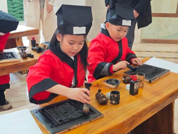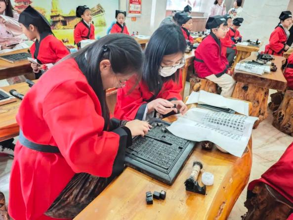 活字印刷,古老技艺的宝箱悄然打开,用手触摸木质活字,精心排列句子,感受水墨与纸张交织的节奏。当一页一页的印刷作品是从小手中产生的时候,不成熟的脸上绽放出收获的喜悦。