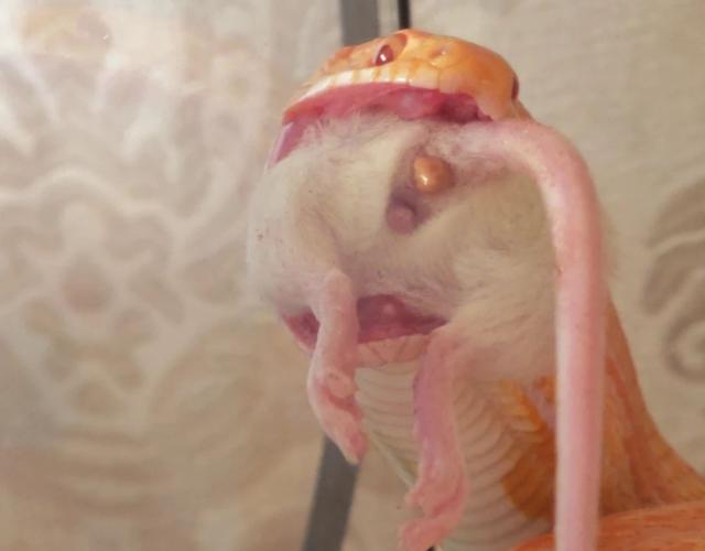 第一次喂他吃冻鼠,怕他吞不下去,把鼠鼠剪掉,吃饭时他拍的照片,看上去像是在笑。。如今我有经验,但不太养爬,退圈了。