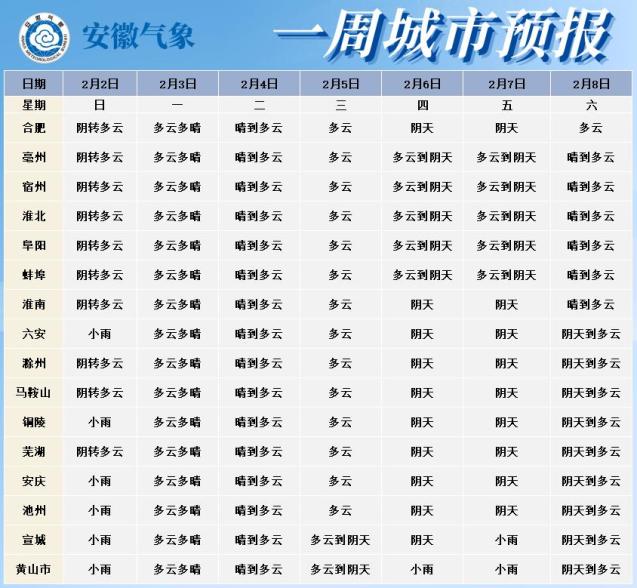 6-7日(周四):淮北地区多云至阴天;淮河以南阴天,临江江南部分地区有小雨,皖南山区部分地区有雨夹雪或雪。