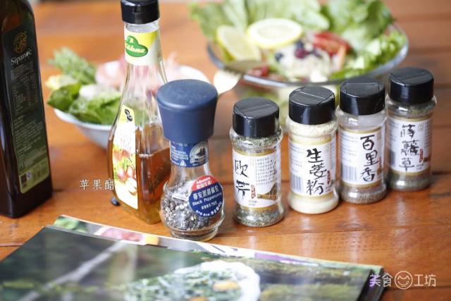橄榄油 50ml、苹果醋 15ml、蜂蜜 15ml、百里香、黑胡椒、香芹碎、姜粉、第戎芥末(不加)