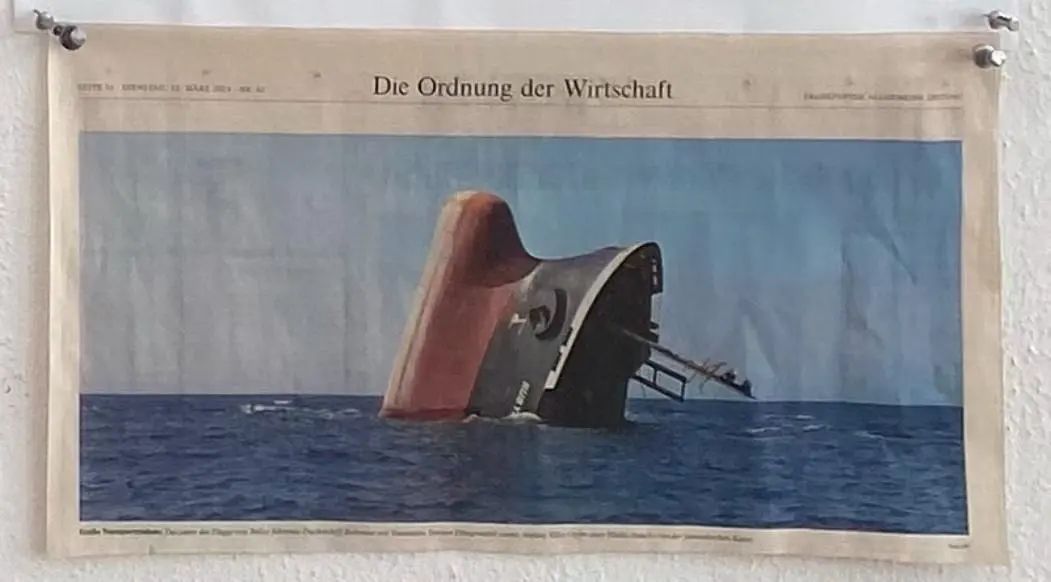 艺术家还通过绘画与最近的全球事件形成了对话。例如,在一系列名为“鲁比马尔号”的绘画中,主题是2024年英国货船的火爆和命运。