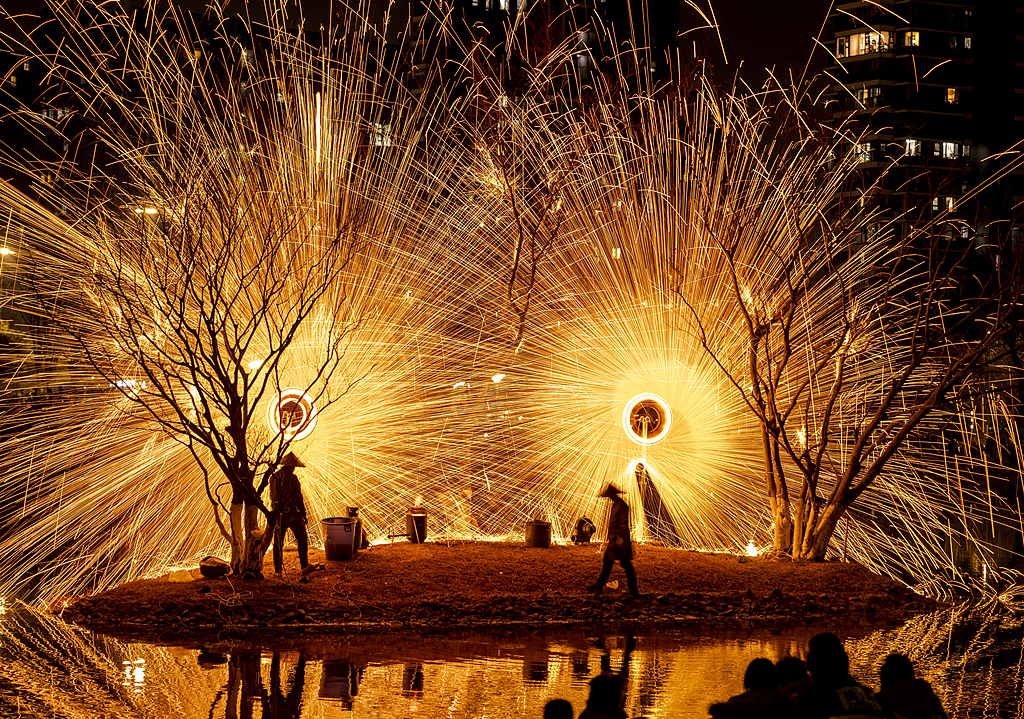 演奏铁花的过程充满了力量和美感。表演者将钢块加热至1600℃以上,融化成钢水。表演者手持木勺,用力将钢水洒到空中或与硬物碰撞,使钢水在空中爆裂成千上万的火星。火花飞溅时与空气接触,瞬间冷却,形成一派绚丽多彩的壮观景象,如“火瀑”或“满天星雨”。整个表演通常伴随着鼓乐和锣声,营造出热闹的节日气氛。在火花喷涌之间,观众仿佛置身于火树银花的奇幻世界。