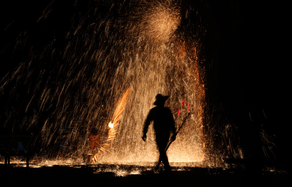 河北省蔚县被称为铁花的发源地之一,其表演以壮丽的场景和传统的民间仪式而闻名。表演者经常穿着特殊的防火服,洒钢水的动作充满力量感。蔚县人认为,打铁花代表着送旧迎新、避邪祈福、祝新年美好。