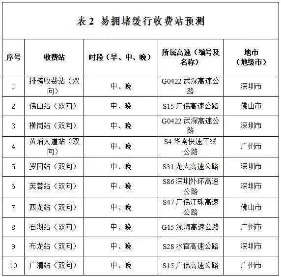 根据广东交警的消息,预计3-5日,广东将迎来返程高峰。节后返程人流密集,道路拥堵程度将高于节前。广东交警提醒很多司机朋友,不要危险驾驶,不要超员载人,不要非法经营,不要酒后驾驶,要牢记“生命至上,安全第一”。根据广东交通管理部门和省交通运输厅的联合判断,今年春运高峰期道路拥堵、收费站、车流饱和的服务区、充电设施利用率高的服务区如下图所示。