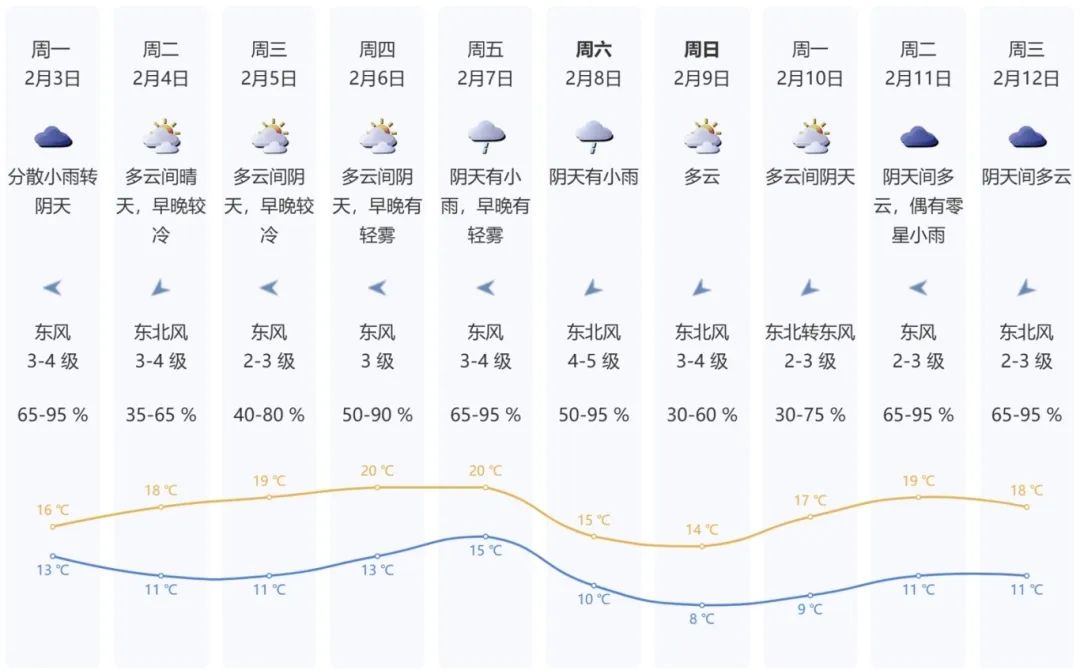 二月三日,小雨分散转阴天;气温13-16℃;东风3-4级;相对湿度为65%-95%。