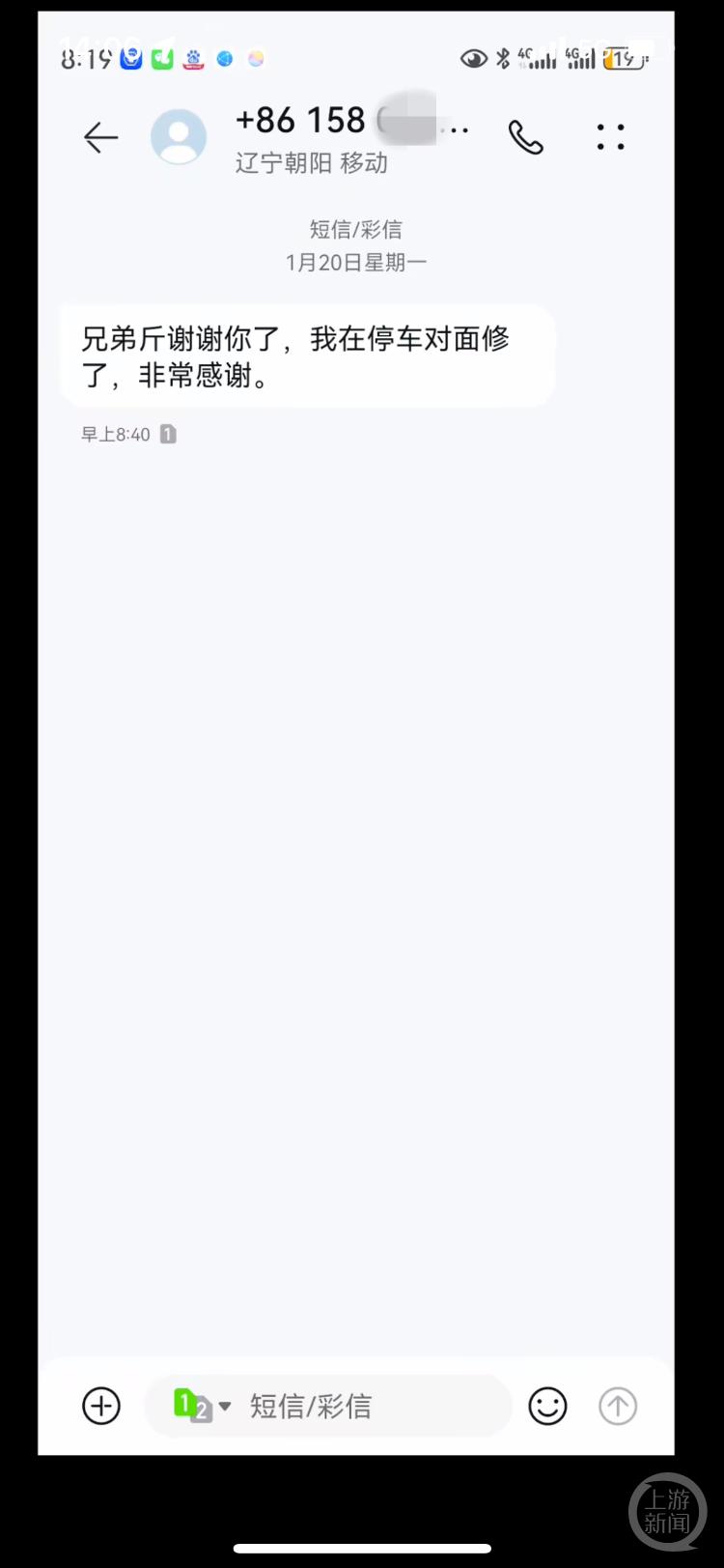 卡车司机发短信感谢。录像截图