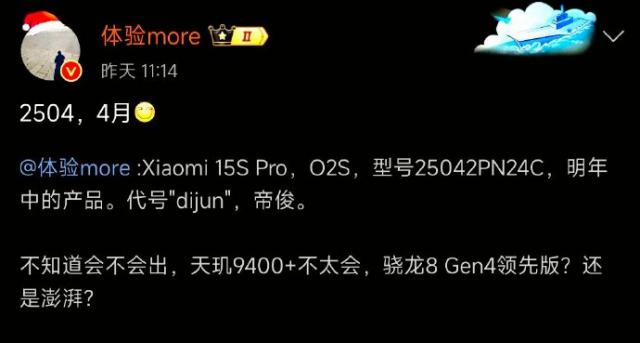 爆料表示,小米 15S Pro 会换上「呼吁极高」处理器,但不是骁龙。 8 至尊版。