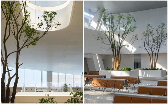 随之而来的是明亮的天窗,郁郁葱葱的植被,充满放松的生态与城市空间融为一体的环境。
