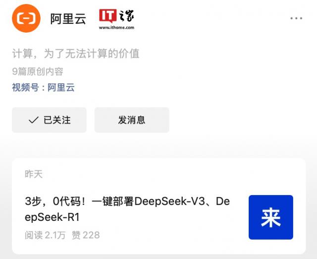 IT 世家 2 月 4 每日消息,阿里云计算有限公司昨日发文,阿里云计算有限公司 PAI Model Gallery 支持云端一键部署 DeepSeek-V3、DeepSeek-R1。