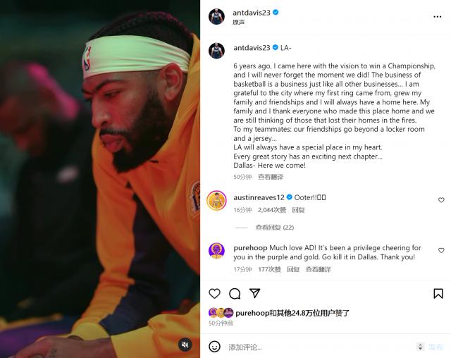 北京时间 2 月 4 一天早晨,浓眉更新社交媒体,发布长文告别湖人队:“六年前,我带着夺冠的理想来到这里。我很感激洛杉矶,我在这里获得了我职业生涯的第一个冠军。但是每一个伟大的故事都有一个令人兴奋的新篇章,达拉斯,我们冲吧!”