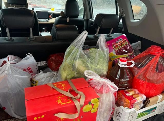 土鸡,青菜,红薯,肉粽,还有小时候爱吃的甜点,后备箱里装满了妈妈的爱。
