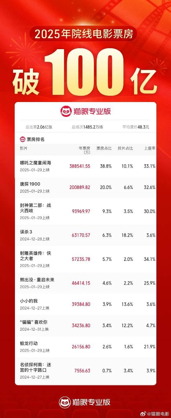 与此同时,根据猫眼专业版数据,北京时间 2025 年 2 月 3 日 16 时 45 分,2025 中国电影年度票房(包括预购即时)突破 100 亿元大关。超越北美票房成绩,居世界第一。