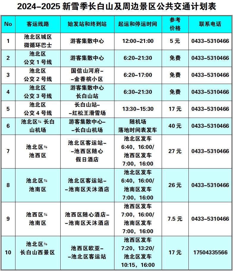 注:一是上述线路已纳入“长白山一机游”小程序“交通出行”中的“城市景区综合出行”栏目,可实现网上预约包车和专车。第二,出租车和网约车都可以通过“吉林租赁”小程序约车,实现“网上约车、网上结账或线下计费”。第三,原巡游出租车电话号码(池北区0433-5315678,572999,5980000000;池西区、池南区0439-6331555)仍然正常使用。上述方案仅供参考,会因下雪、紧急情况等不可抗拒因素而出现缓发、停发等控制措施,具体以实际发班车次为准。(长白山管委会交通运输局)