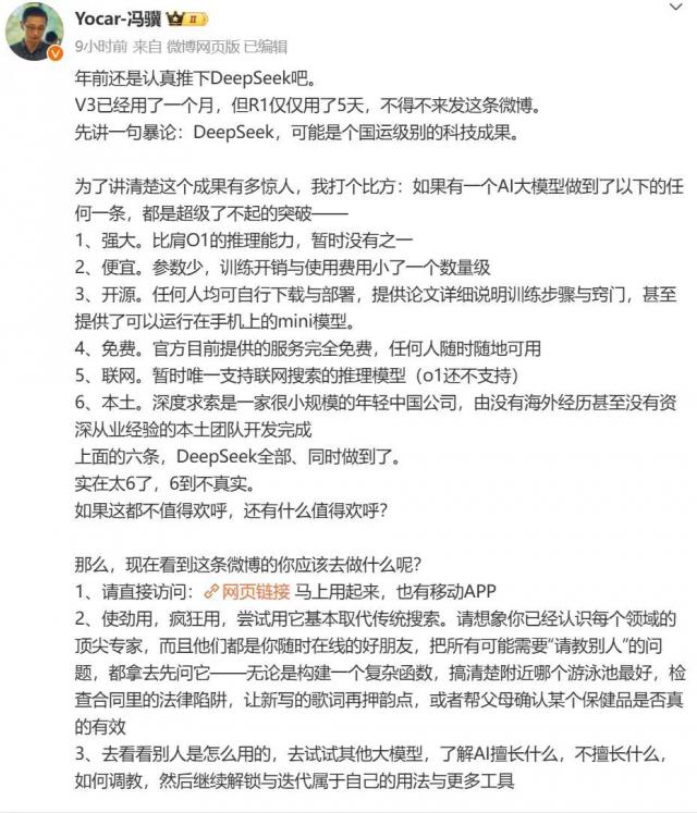 ▲《黑神话 · 《悟空》的制片人冯邈将 DeepSeek-R1 看看国运级别的科研成果。