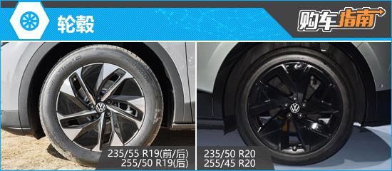 2025 款 ID.4 CROZZ 轮毂的形状发生了一定程度的变化,其中两款低端车型与旧车型保持一致。由于黑暗骑士黑光包套件的加入,两款高端车型的黑色轮毂风格更加时尚运动。在轮胎方面,纯享版配置规格为 235/55 R19 的轮胎,PURE 版规格为前 235/55 R19 后 255/50 R19,PRO 版为前 235/50 R20 后 255/45 R20,PRIME 版配置前 235/45 R21 后 255/40 R21 的轮胎。
