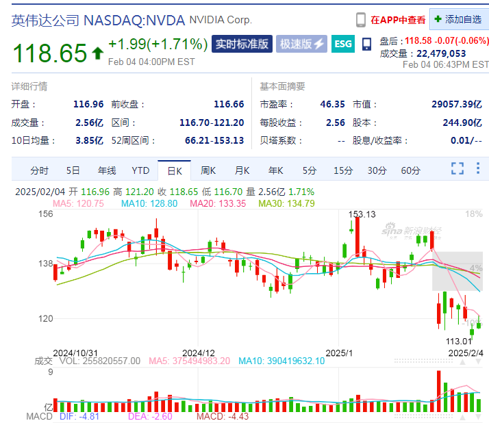 值得注意的是,英伟达作为世界领先的AI芯片,正在遭受市场的强劲销售。当地时间2月4日,英伟达的股价报告为118.65美元。与今年1月的高点(153.13美元)相比,累计跌幅达到23%,总市值挥发超过844亿美元(约6.1万亿元人民币)。