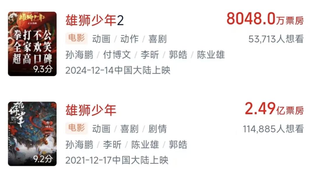 暑期档《白蛇:浮生》再现了许仙白娘子动人的感情,推动了市场上“白蛇传”的走红。最终票房刚刚超过4亿,远低于预期;《落凡尘》《伞少女》被誉为美丽的画风,粉丝们在社会媒体上跑来跑去,但票房只有3805万和1911万。12月上映的《狮子少年2》充满了故事和制作,豆瓣8.5,但依然无法吸引观众进入电影院,人物设计争议持续发酵。最终8000万的票房不如第一部的三分之一;《小倩》定档改档,再回来也跑不动了,最后票房不到1300万。
