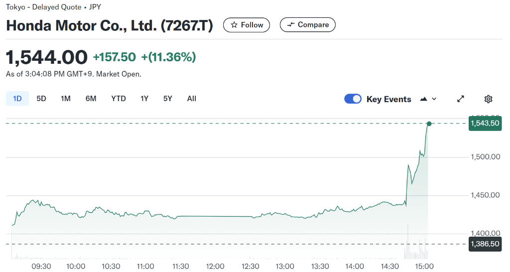 消息公布后,市场反应强烈。截至发稿时,本田汽车短期涨幅超过11%,而日产汽车股价由涨转跌超过4%,因为市场担心其未来发展的不确定性。