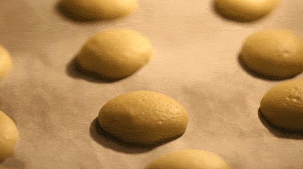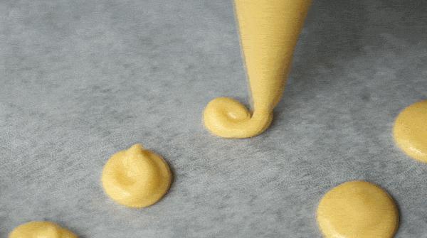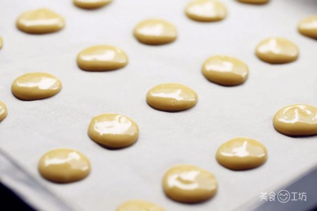 6. 将一个小孔剪在裱花袋的尖端,在烤盘上铺上一层烘焙纸,然后将面糊挤出一角硬币大小的圆面浆。